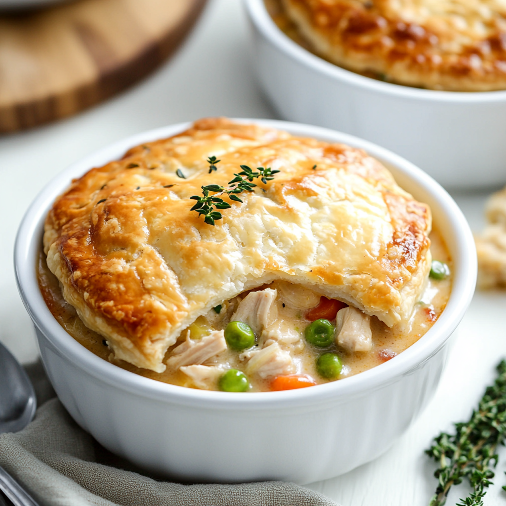 Bake It Up: Once cooked through, scoop the filling into bowls, then top each bowl generously with puff pastry before baking until golden brown—about 15-20 minutes or until crispy perfection is achieved.
