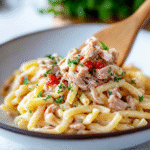 Indulge in this creamy tuna pasta, a quick and satisfying dish that combines the robust flavor of high-quality tuna with perfectly cooked pasta. Enhanced by fresh garlic, sweet cherry tomatoes, and aromatic basil, this meal is not only delicious but also a delightful reminder of cozy family dinners. Perfect for busy weeknights, it’s ready in under 30 minutes!