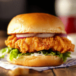 Crispy, golden-brown chicken sandwiched between two toasted buns, dripping with zesty sauce and topped with fresh lettuce. The aroma wafts through the air, making your mouth water before you even take a bite. This crispy chicken sandwich isn’t just food; it’s an experience that brings joy to every gathering, turning any mundane afternoon into a feast of flavor.